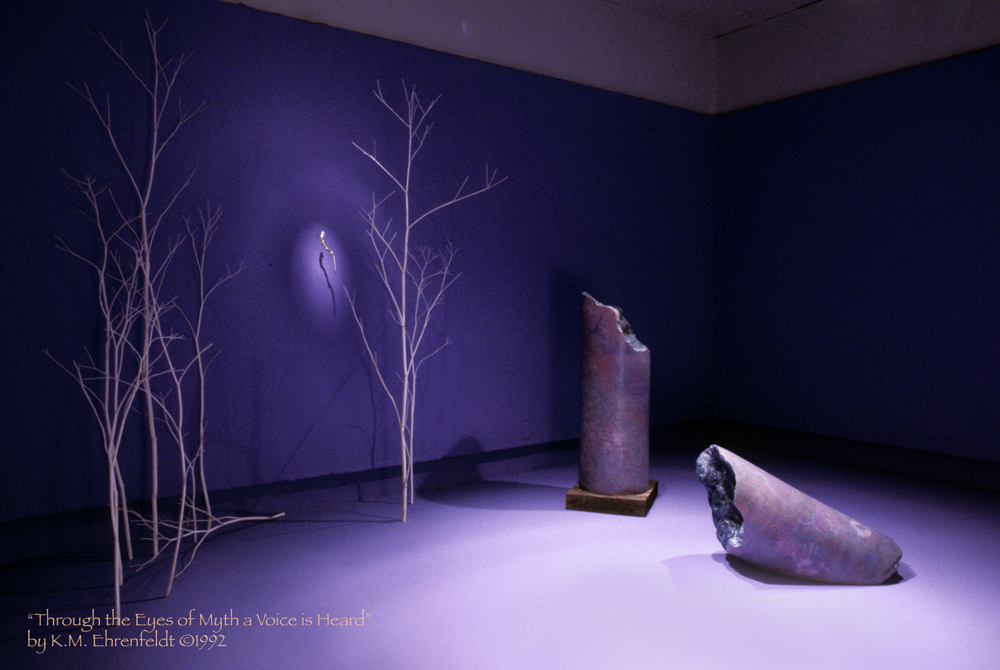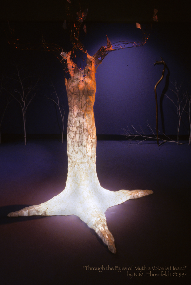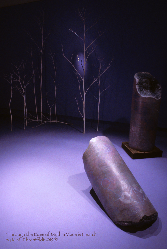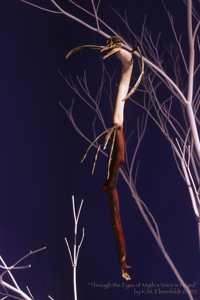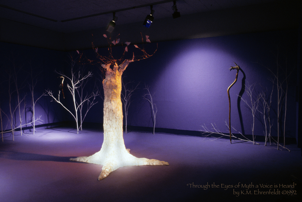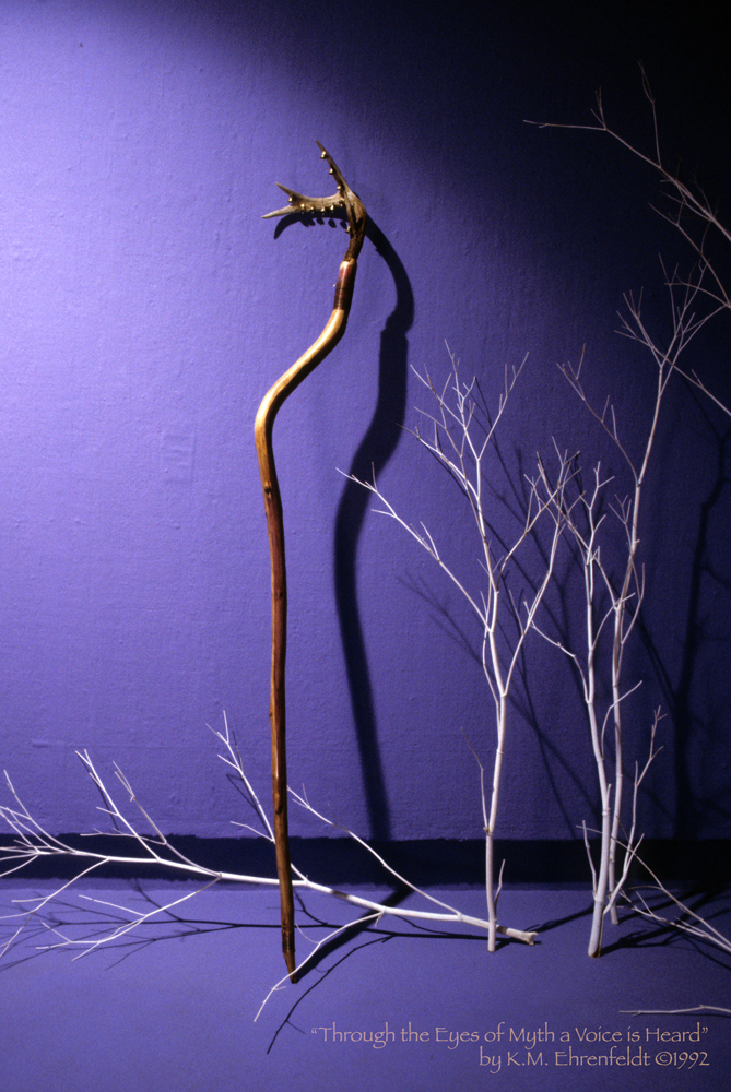 The tools of the storyteller, in many cultures throughout history, have been the talking stick and the staff. Using these tools, a teller awakens archetypal memories that have their roots in the mythic foundations of the past. Telling stories often aids individual and community healing, while visual art assists in sparking a story within the viewer. In Through the Eyes of Myth a Voice is Heard, I explored unifying the telling performance with a visual art environment to provide a unique experience for listening viewers.