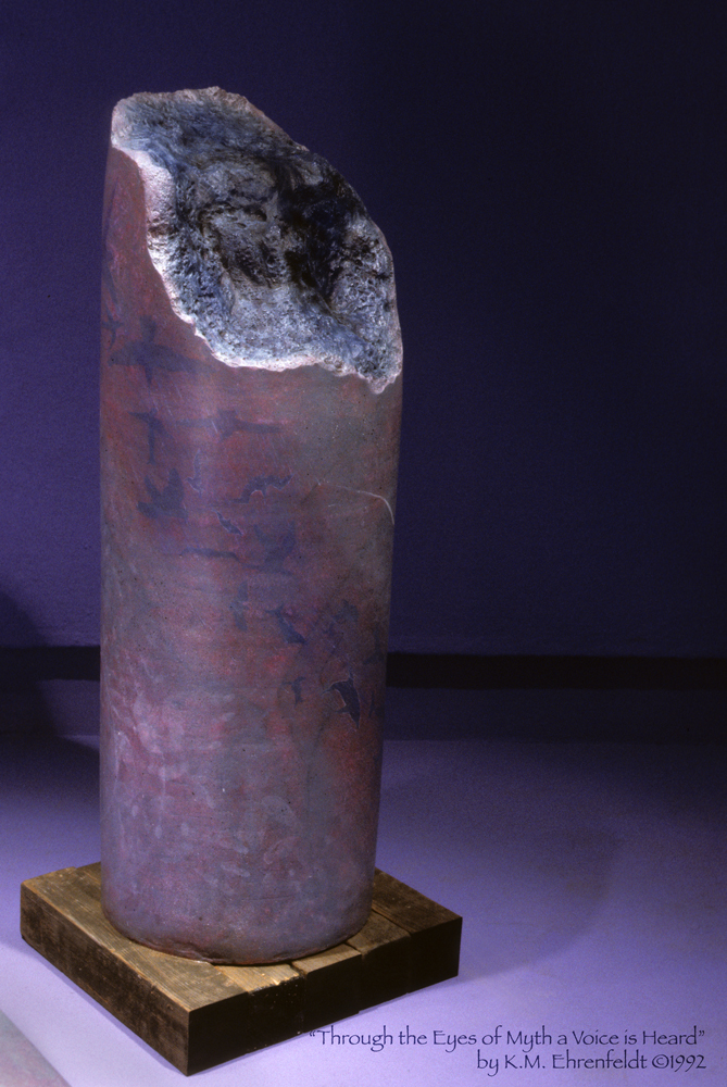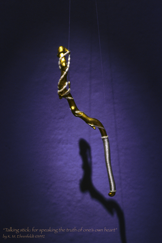 Important to me, at this point in time, was bridging the fine art world’s arcane nature with accessibility to the artistic ideas with average viewers from the community. Inspiration arrived in the form of the talking stick, The Storyteller, which compelled me to study the art of storytelling, an impulse quite foreign to the art world at that time! …I postponed my MFA for a year to study storytelling in the drama department.